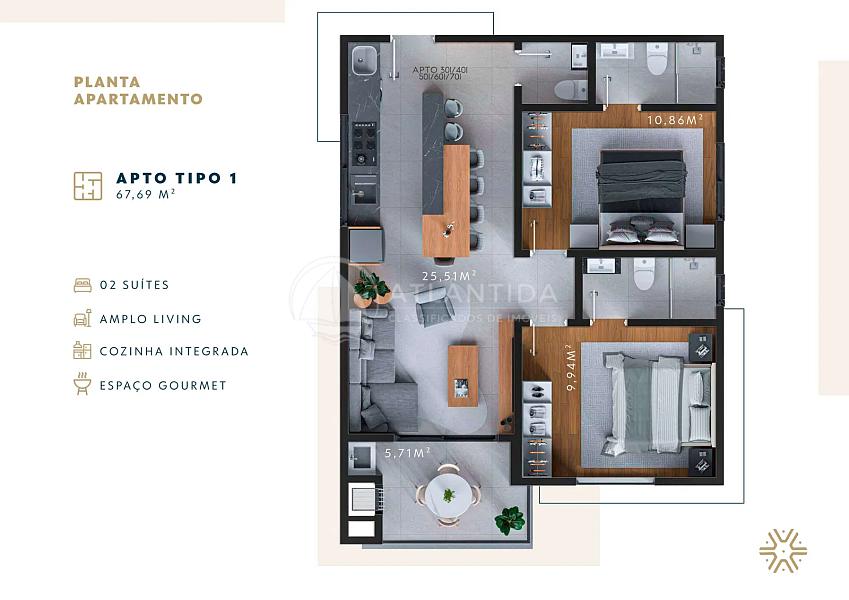 Apartamentos modernos com 2 suítes, living integrado, sacada com churrasqueira, lavabo e garagem privativa.